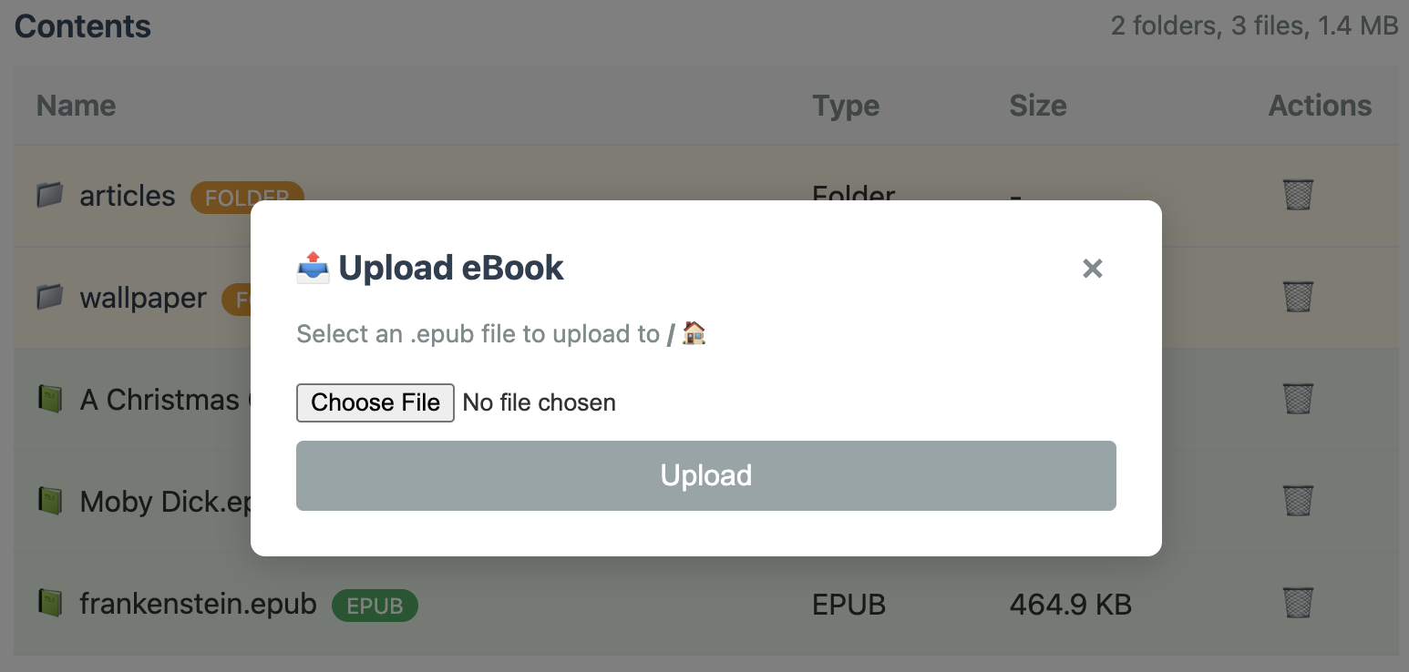 - Upload EPUB files wirelessly from any device on the same WiFi network